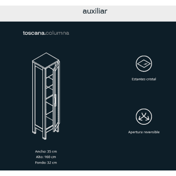 Medidas Columna Auxiliar suelo 146cm alto x 35cm ancho x 32cm fondo (Reversible para apertura derecha o izquierda) con estantes separadores en vidrio