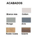 Acabados en Blanco Ada (Blanco Mate), Cotton Mate, Avio Mate, Musgo Mate, Madera Roble Costa o Madera Valenti