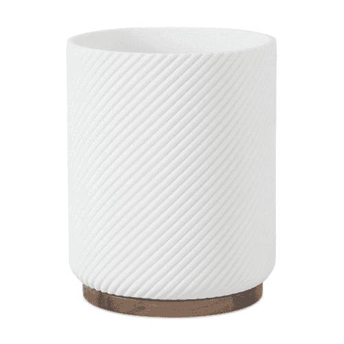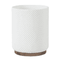 Papelera fabricada en resina con terminación en Blanco Mate labrada y pie en Madera Natural