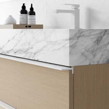 Usos tanto como encimera independiente suspendida a pared con soportes o como encimera lavabo para integrar en mueble