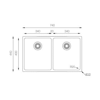 -Las medidas exteriores del fregadero son 74 cm largo x 44 cm ancho. Las medidas de cada cubeta son 34 cm largo x 40 cm ancho.