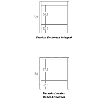 Opción a elegir para completar con lavabo sobre-encimera (opción tapa superior en color MDF elegida sin perforaciones para instalar cuaquier modelo lavabo compatible y griferia o opción para lavabo integral con faldones MDF elegida para ocultar parte baja de encimera integral)