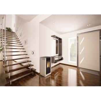 Estufa de pellet modelo Flora Ferlux disponible de 8Kw,10 Kw de potencia y en 3 acabados Blanco perla, Rojo imperial y Negro
