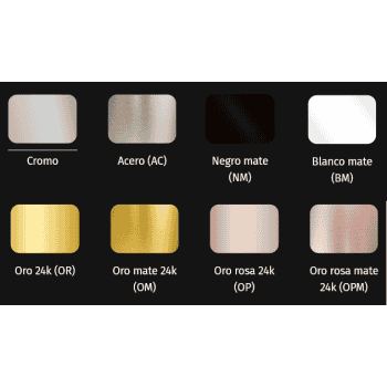 Acabados Cromo Brillo, Acero Mate, Negro Mate, Blanco Mate, Oro Brillo 24k, Oro Mate 24k, Oro Rosa Brillo 24k o Oro Rosa Mate 24k