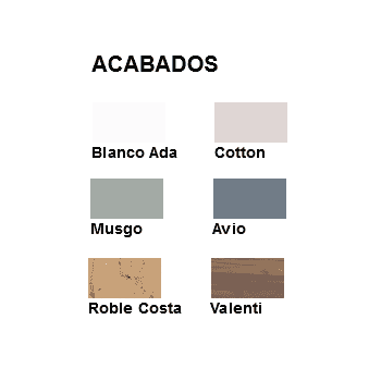 Acabados en Blanco Ada (Blanco Mate), Cotton Mate, Avio Mate, Musgo Mate, Madera Roble Costa o Madera Valenti