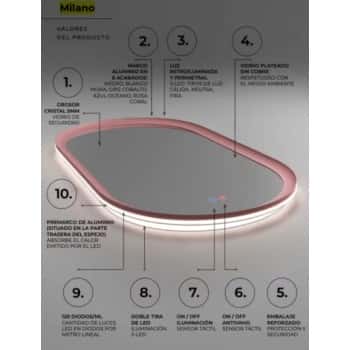 Espejo led modelo Milano ovalado con marco metálico en 6 terminaciones de color y luz led doble en lateral marco como en parte trasera