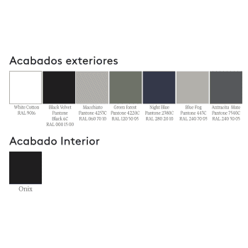 Acabados: Cromo Brillo, Negro Mate, Acero Inox, Black Gun Metal, Oro Cepillado, Oro Rosa Cepillado o Niquel Cepillado