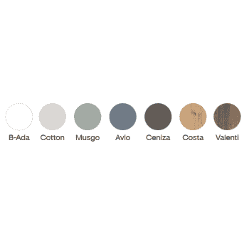 Acabados en Blanco Ada (Blanco Mate), Cotton Mate, Avio Mate, Musgo Mate, Ceniza Mate, Madera Roble Costa o Madera Valenti