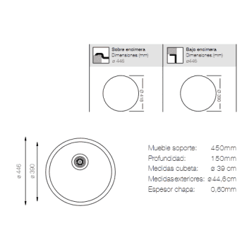 Fregadero acero inox 1 seno redondo bajo encimera o sobre-encimera