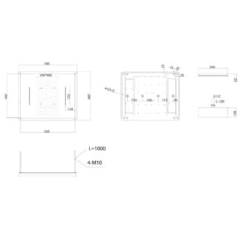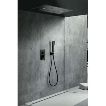 Rociador de acero inoxidable rectangular de 48x59 cm extraplano, cromado o negro mate y antical de 3 salidas de agua opcionales.