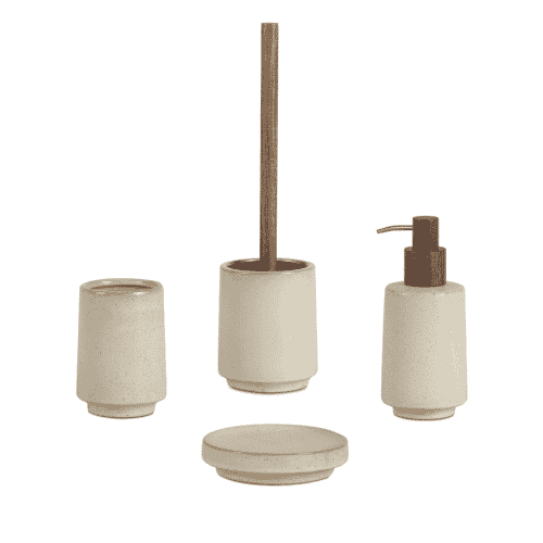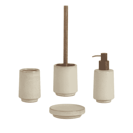 Accesorios de baño fabricados en ceramica vitrificada en color beige con bastagos en madera