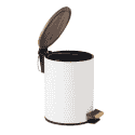 Esta papelera para baño tiene una capacidad de cinco litros y dispone de tapa a pedal. De acero inoxidable, en color plateado de acabado brillo, con ribetes negros en la tapa y en la base y metal cromado en el pedal. De forma cilíndrica, dispone de un cubo interior para facilitar su limpieza y vaciarla más cómodamente. Un diseño neutro y funcional pensado para encajar en baños de todos los estilos.