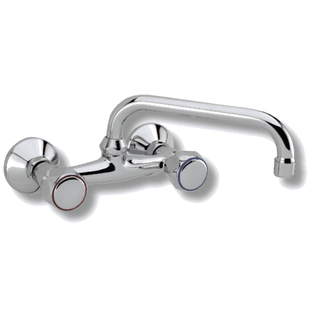 Grifo bimando de pared para fregaderos con caño giratorio.
