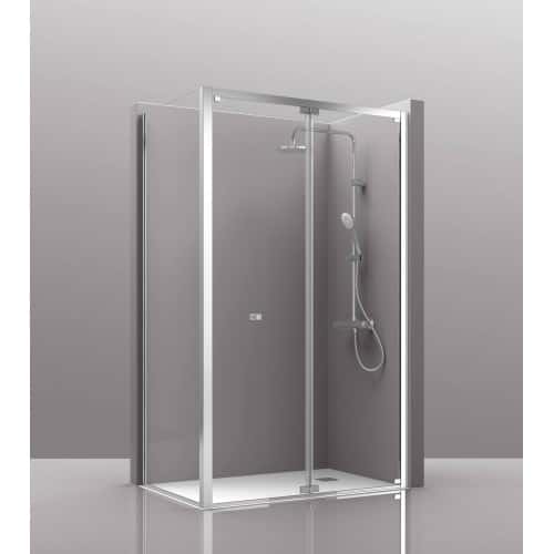 Mampara angular 2 hojas fijas y 1 hoja corredera frontal.